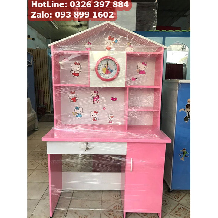 Bàn học sinh bằng nhựa có kệ sách là loại bàn học được làm bằng nhựa Đài Loan, thiết kế có thêm kệ sách trên bàn, Loại bàn học này với nhiều màu sắc tươi sáng, có hình ảnh sinh động như là : Bàn học doremon, bàn học siêu nhân, Bàn học hello kity,..v.v. Ưu điểm chính của loại bàn học này đó chính là có nhiều hộc tủ, ngăn kéo và kệ sách, giúp các bé có thể sử dụng và đựng khá nhiều các dụng cụ học tập như sách vở, bút viết, thước kẻ hoặc là cặp sách 1 cách ngăn nắp.